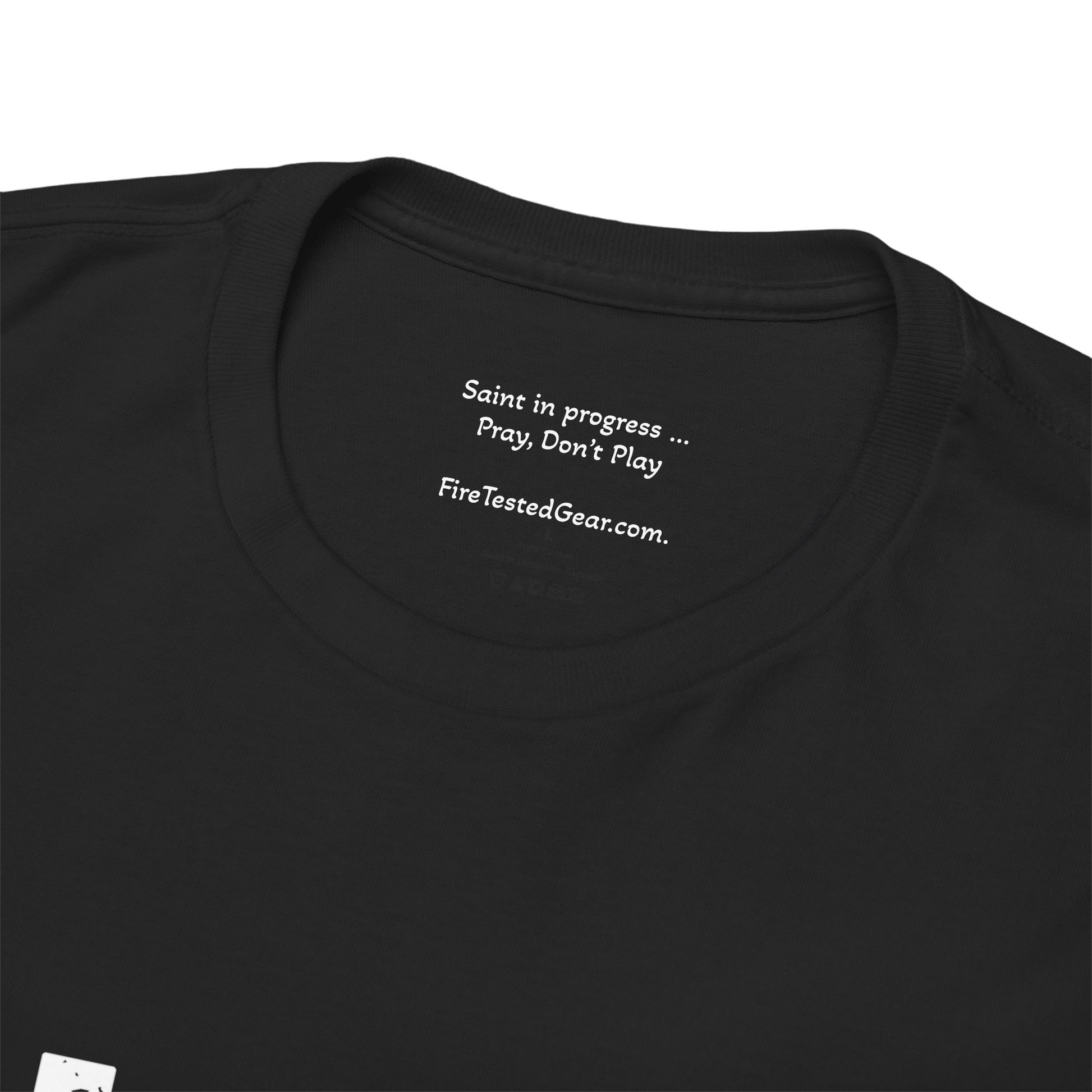 🧵 Clean inner neck label Easter egg: “Saint in progress … Pray, Don’t Play.”